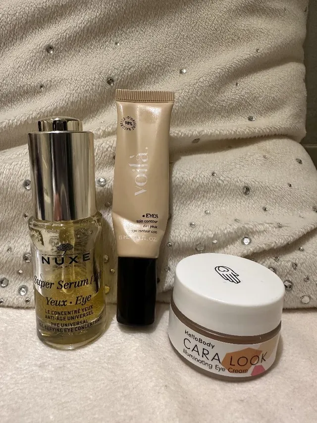 Actuellement tous les matins j´utilise le sérum de chez Nuxe ( Le super sérum 10) , associé à la crème de chez Voilà. , puis je finis avec l´illuminateur de chez Hello Body Cara Look .