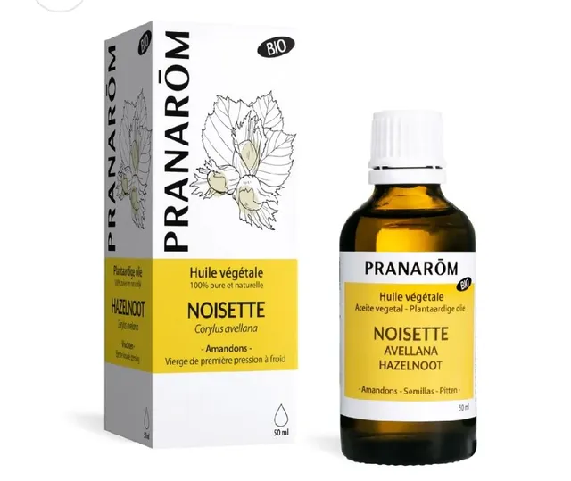 Ensuite, j'applique de l'huile de noisette...et oui, tout simple mais efficace ! 3 gouttes suffisent, appliquées en massage sur tout le visage. Cette huile régule le sébum et donc évite les boutons dûs au sébum. J'utilise celle de la marque pranarom mais il y a beaucoup de marques qui en proposent avec des prix très fluctuants.