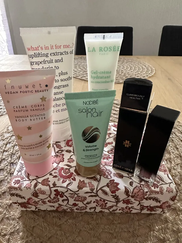 maquillage avec Josephine, soin visage avec la rosee, cheveux avec nocibe et pour le corp nous avons un gel douche what´s in for me..? et une creme corp inuwet.