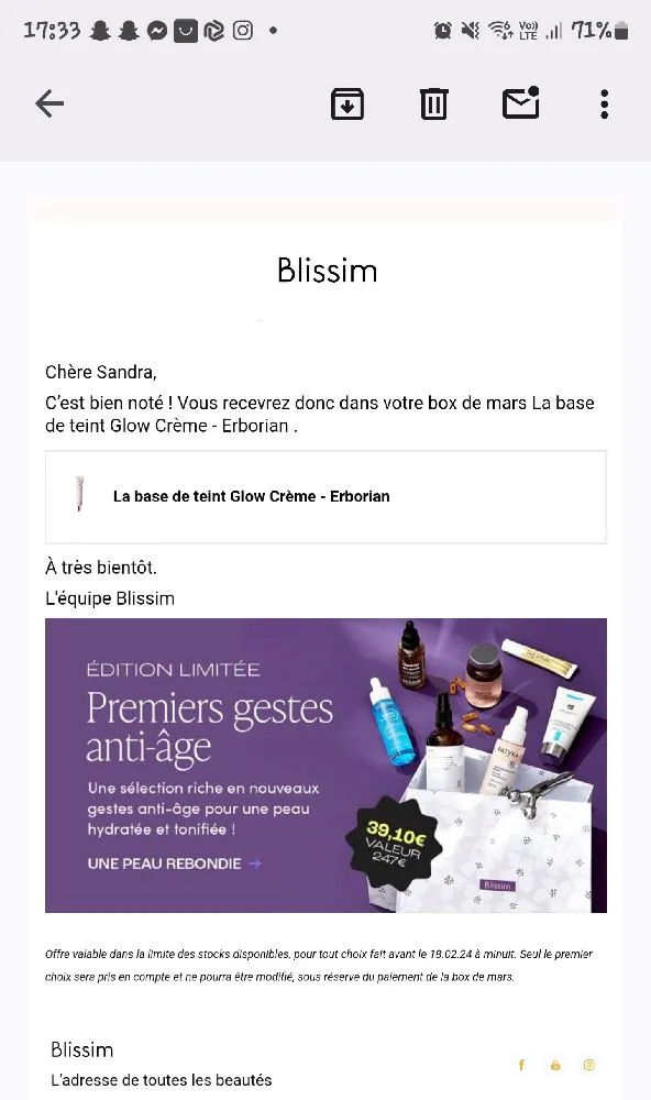 Voici le choix que j’ai fait car justement cette crème me fessait de l’œil depuis un moment j ai bien fait d’attendre vu que je vais la découvrir avec blissim .